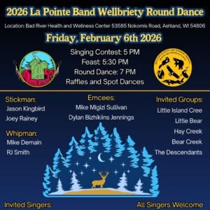Friday, February 6, 2026 Singing Contest 5:00pm Feast 5:30pm Round Dance 7:00pm Raffles & Spot Dances Stickman: Jason Kingbird & Joey Rainey Emcees: Mike Migizi...