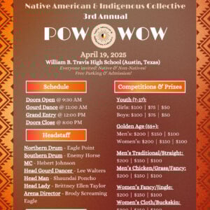 April 18-20, 2025 Admission $5.00 daily; $15 Weekend; 5 & Under and Elders 62+ Free Friday: Registration 5:00pm-7:00pm; Grand Entry 7:00pm (points start) Saturday: Registration...