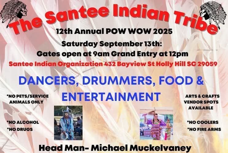 The Santee Indian Organization of SC, one of South Carolina’s State Recognized Tribes, formally invite you to come on out and help us celebrate our 12th Annual Pow Wwow!
