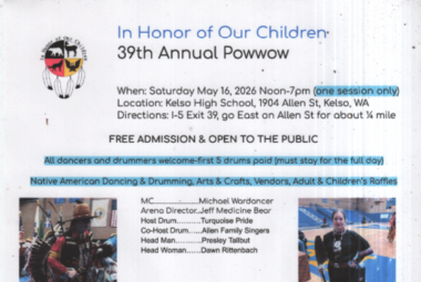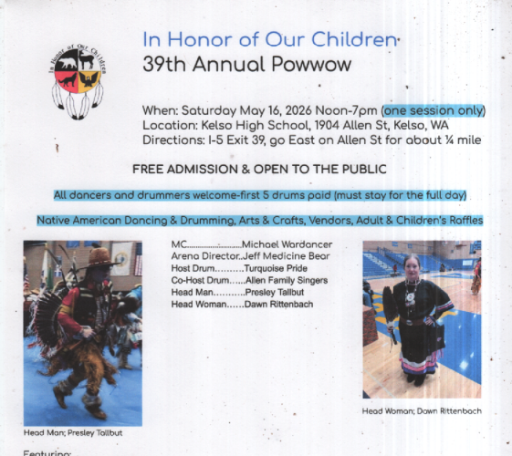 The Kelso “In Honor of Our Children” pow wow is a traditional pow wow which is open to all people. We are not a competition event.
