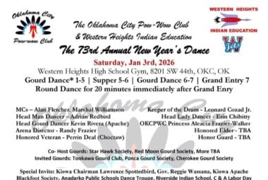 *Attention all Gourd Dancers: The OKCPWC respectfully asks all gourd dancers to adhere to Kiowa Gourd Dance protocol: long-sleeve dress shirt, dress pants (no jeans) & dress shoes. No hats except otter, please. Aho Due to time constraints, all specials to be held during the Gourd Dance except main Pow Wow Staff. See AD
