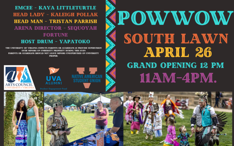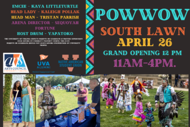Our Pow Wow will be on South Lawn on 4/26 from 10am-4pm, which is right in front of Old Cabell Hall. Grand entry will be at noon!
